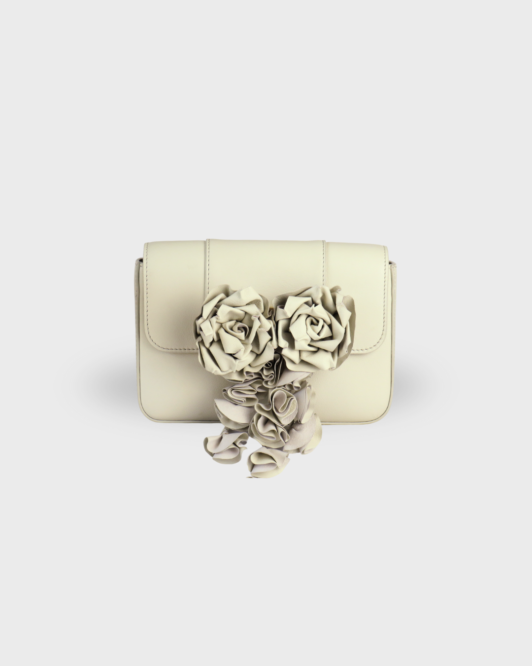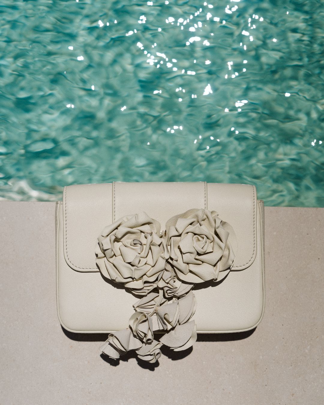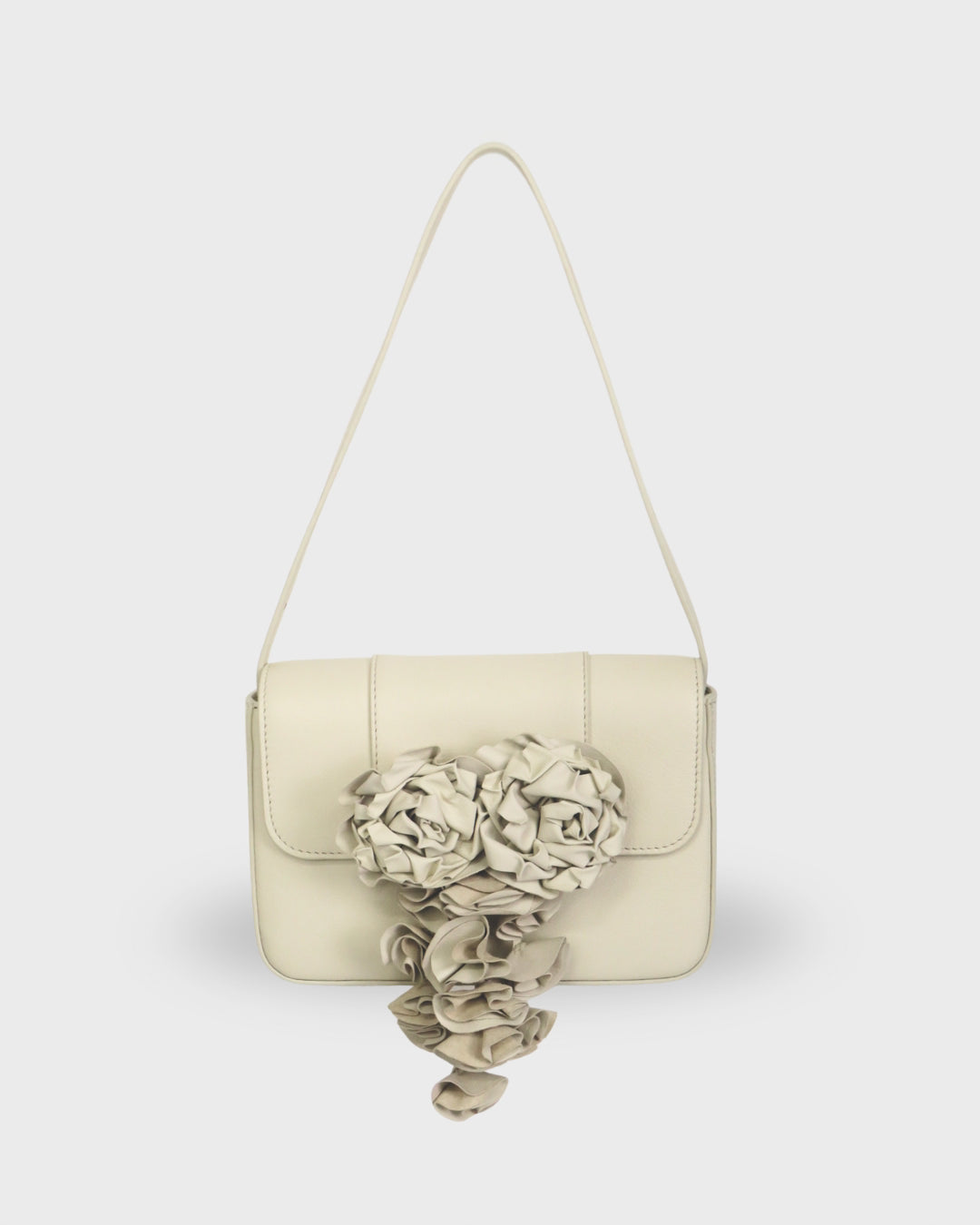 Su tono cremoso y su diseño refinado se ven realzados por un aplique desmontable en forma de cascada floral, hecho en piel.
