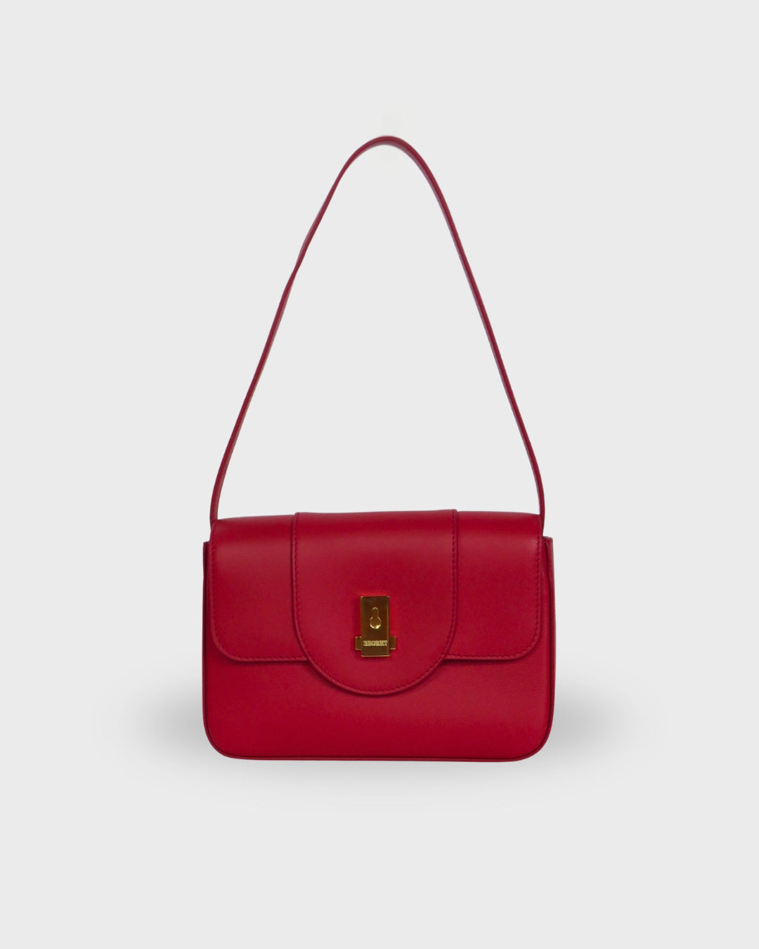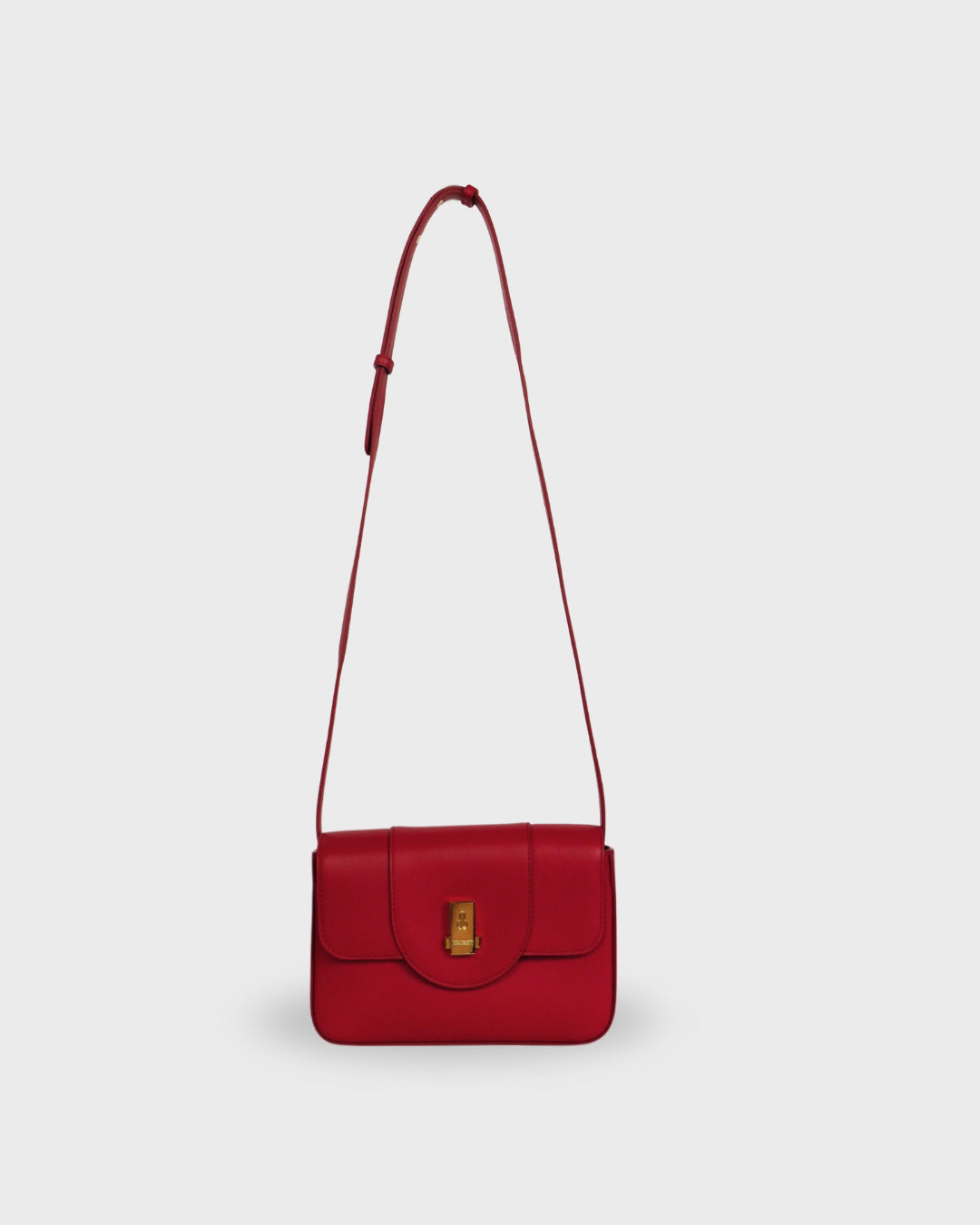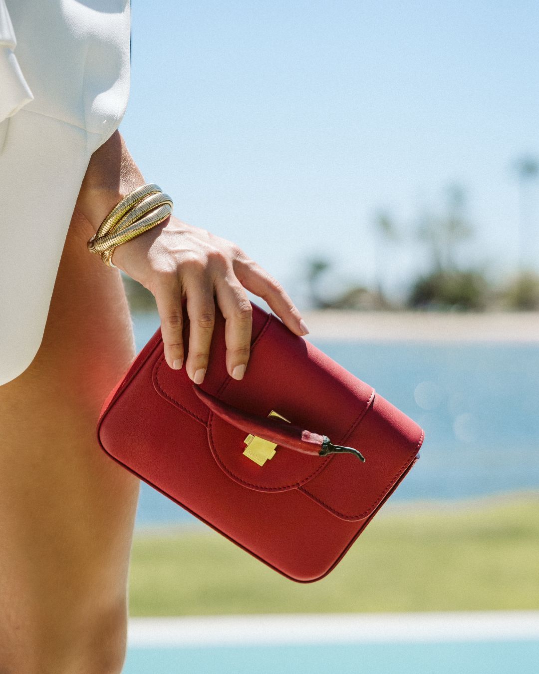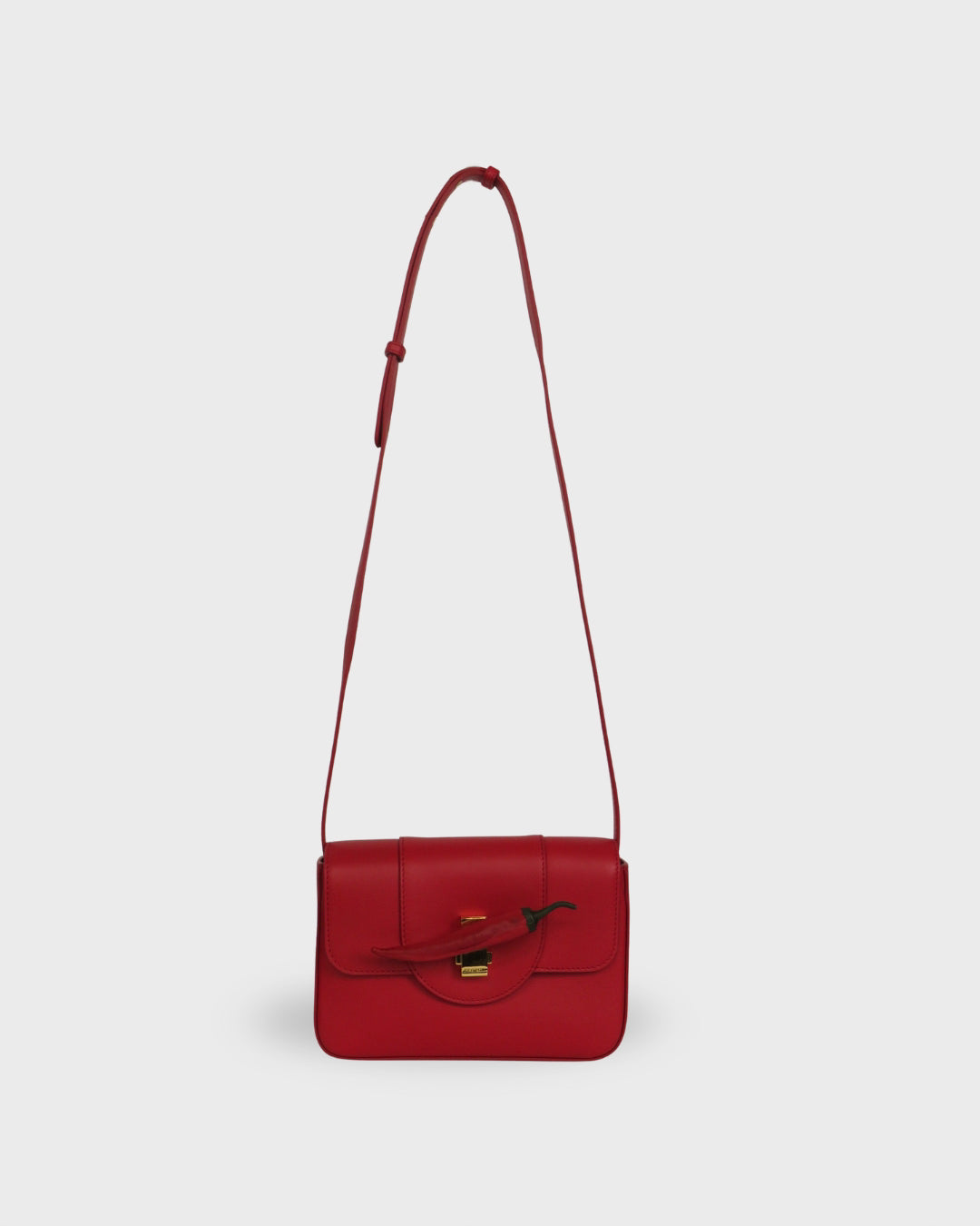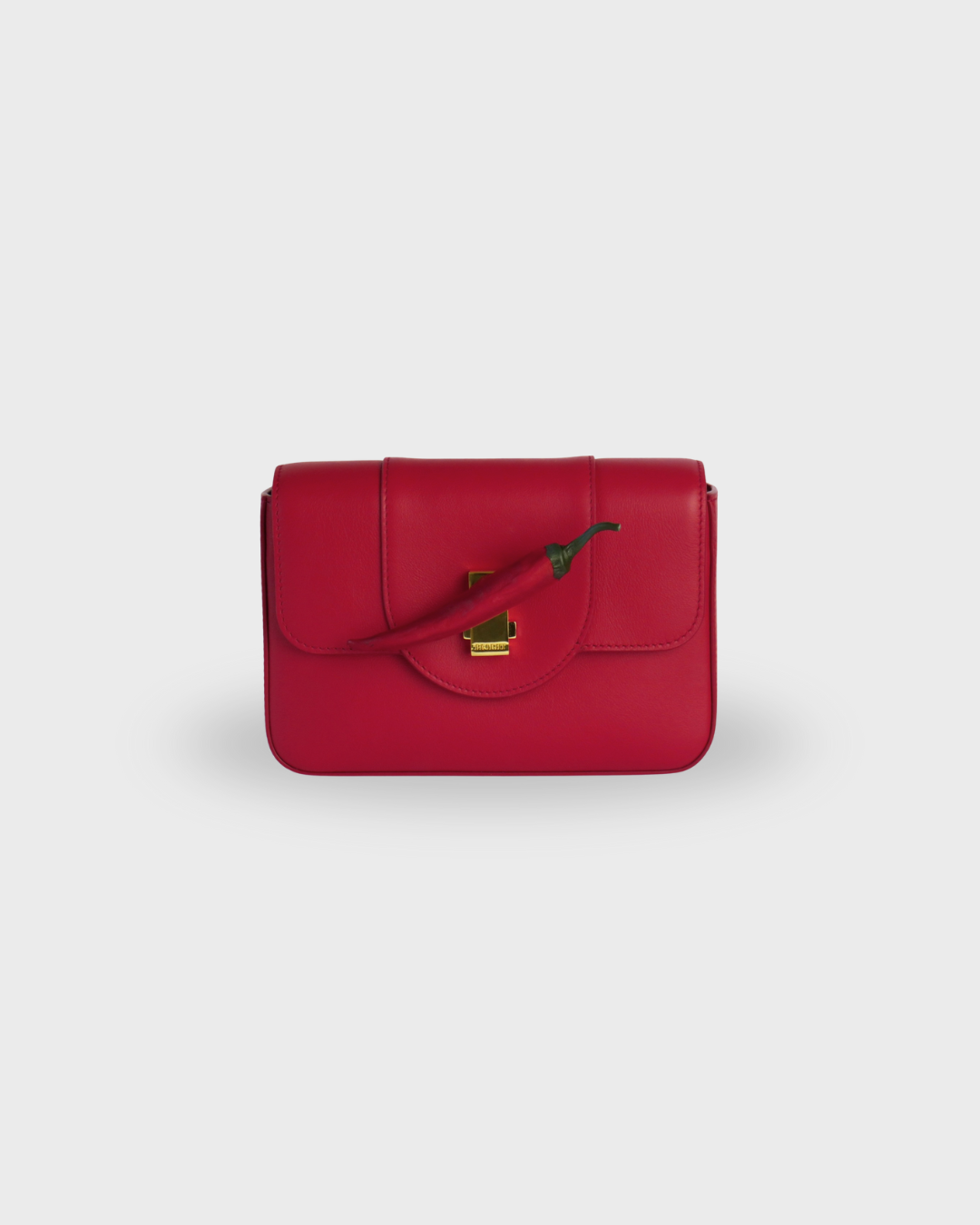 Este bolso llamativo y vibrante combina una elegancia pulida con un toque travieso, gracias a su intenso tono rojo y al atrevido aplique removible en forma de chile, elaborado en piel.