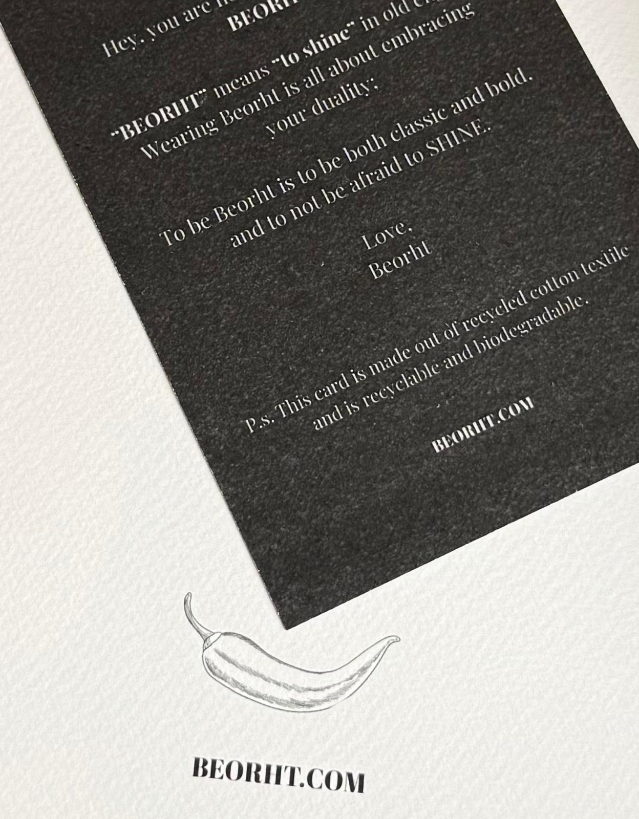 En Beorht, seleccionamos con sumo cuidado cada elemento de nuestro embalaje y materiales impresos para garantizar la sostenibilidad y la responsabilidad ambiental. Nuestras cajas son totalmente reciclables, y nuestro papel de seda, etiquetas, pegatinas y tarjetas se elaboran con materiales 100 % reciclados. Evaluamos meticulosamente los procesos de abastecimiento y fabricación de estos componentes, priorizando los materiales que minimizan el impacto ambiental y promueven la economía circular.