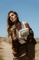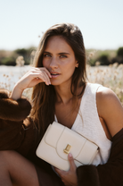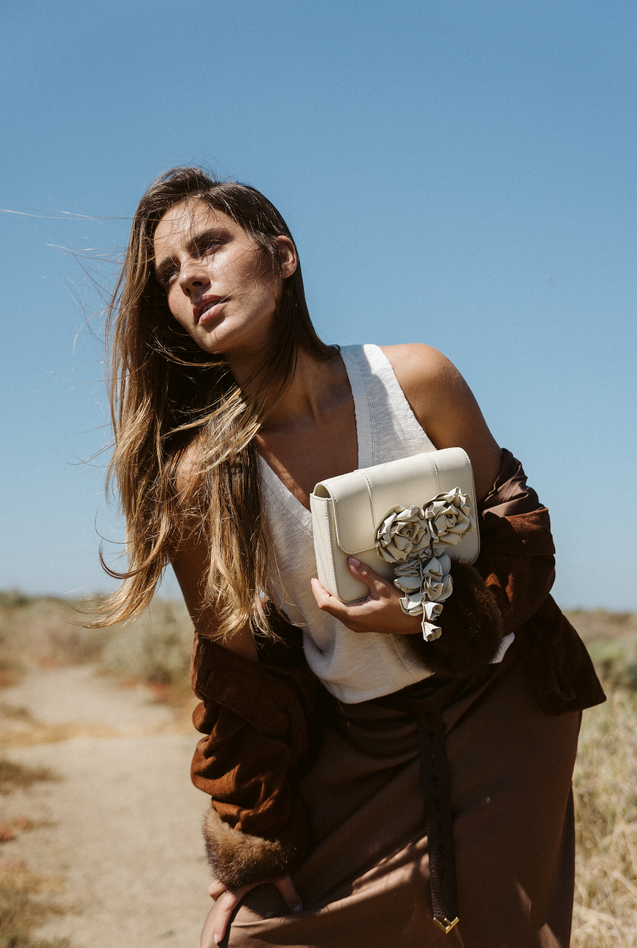 Its creamy tone and refined design is enhanced by a removable floral cascade leather appliqué.